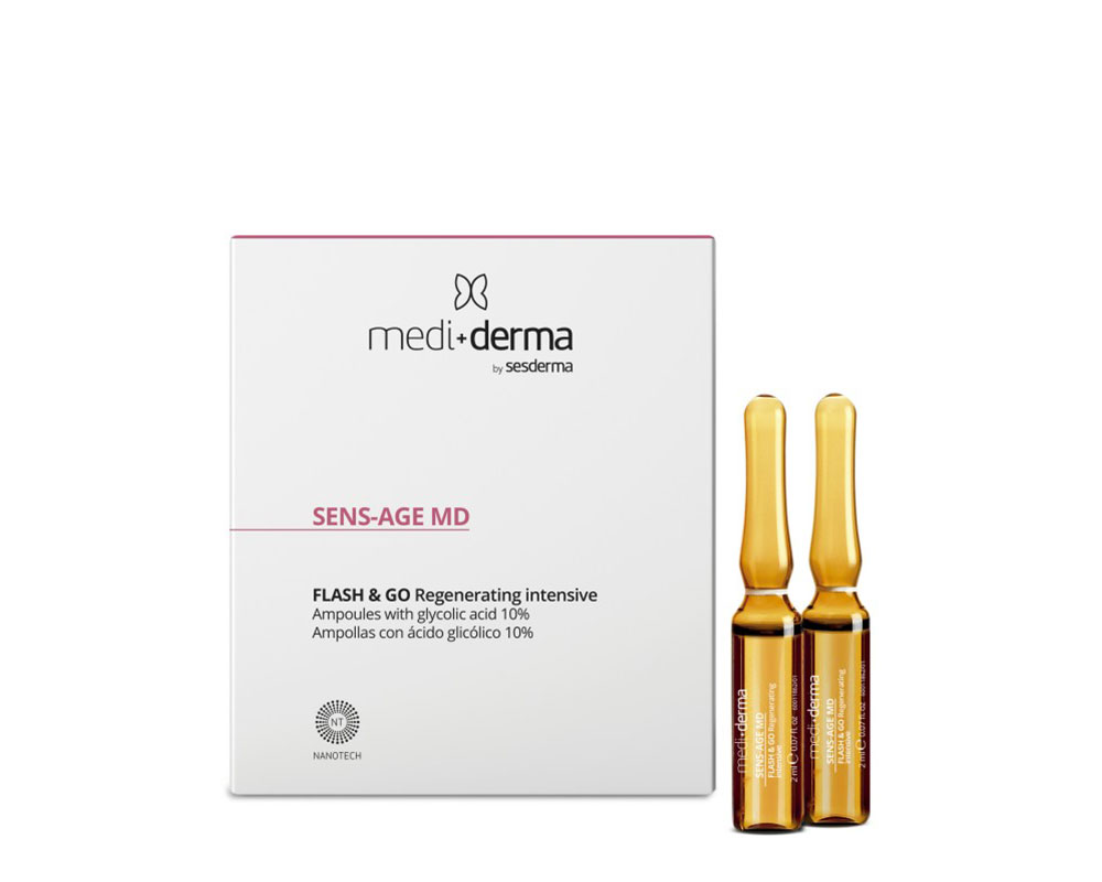 - MEDIDERMA – SENS AGE MD_FLASH & GO – Regenerating Intensive Ampoules with glycolic acid 10% , 5 buc x 2ml – Fiole cu formulă concentrată de acid glicolic10%, acid kojic, ergotionină, acid hialuronic care reînnoiește, hidratează pielea și întârzie îmbătrânirea celulară.