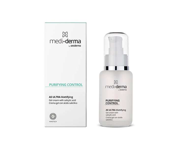 - MEDIDERMA – PURIFYNG CONTROL AS ULTRA Mattifying Gel cream with salicylic acid 50 ml – Cremă gel matifiantă cu acid salicilic, complex regulator de sebum, Niacinamidă (nicotinamide), Aloe Vera, săruri de zinc care exfoliază delicat pielea, previne retenția de sebum, controlează bacteriile, calmează iritațiile.