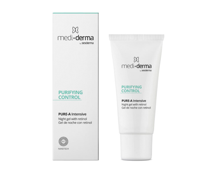- MEDIDERMA – PURIFYNG CONTROL PURE A Intensive Night gel with retinol 30 ml – Gel pentru noapte cu retinol, acid glicirretinic, acid hialuronic, ce realizează o exfoliere delicată, eliberează porii de sebum, stimulează refacerea pielii (colageneza și elastina), hidratează și calmează pielea.
