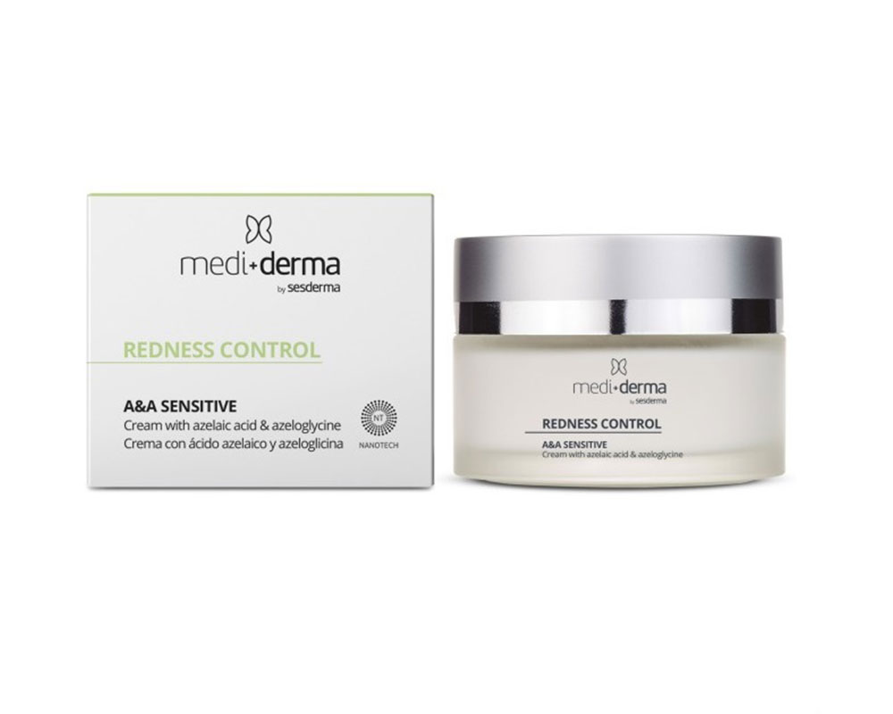 - MEDIDERMA – REDNESS CONTROL A&A Sensitive Cream with azelaic acid & azeloglycine 50 ml – Cremă cu acid azelaic și azeloglicină, silimarină, acid tranexamic, vitamina A, niacinamidă care reechilibrează bariera pielii, calmează iritațiile și roșeața. Pielea se reînnoiește, elasticitatea pielii crește, ridurile sunt netezite.