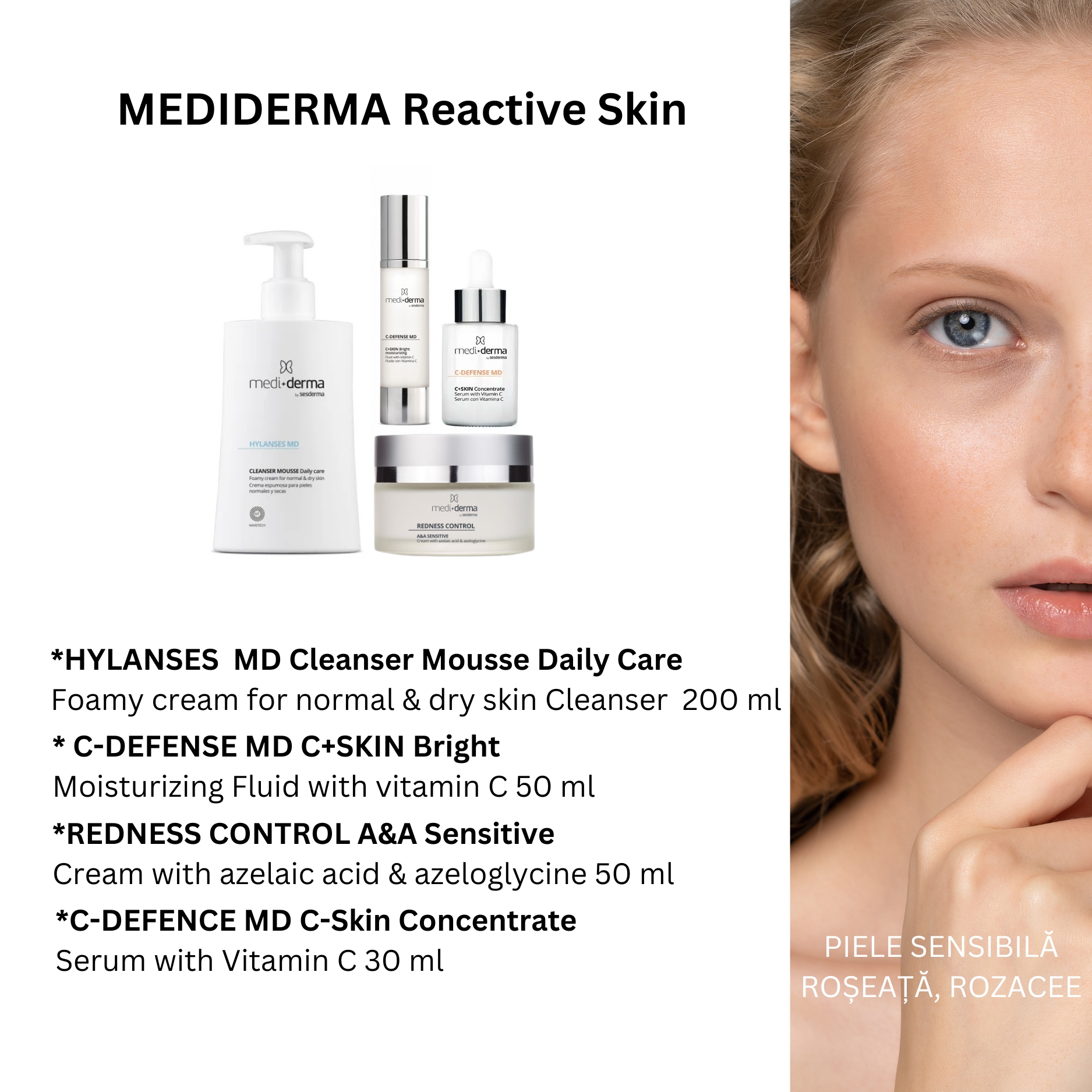 - MEDIDERMA – HYLANSES MD_CLEANSER MOUSSE Daily care Foamy cream for normal & dry skin Cleanser 200 ml – Crema spumoasă de curățare cu extracte de Aloe Vera, ovăz, mușețel, mimoză, triclosan este potrivită pentru orice tip de piele, inclusiv pielea cu manifestări acneice. Îndepărtează murdăria, sebumul, machiajul și are proprietăți antibacteriene.